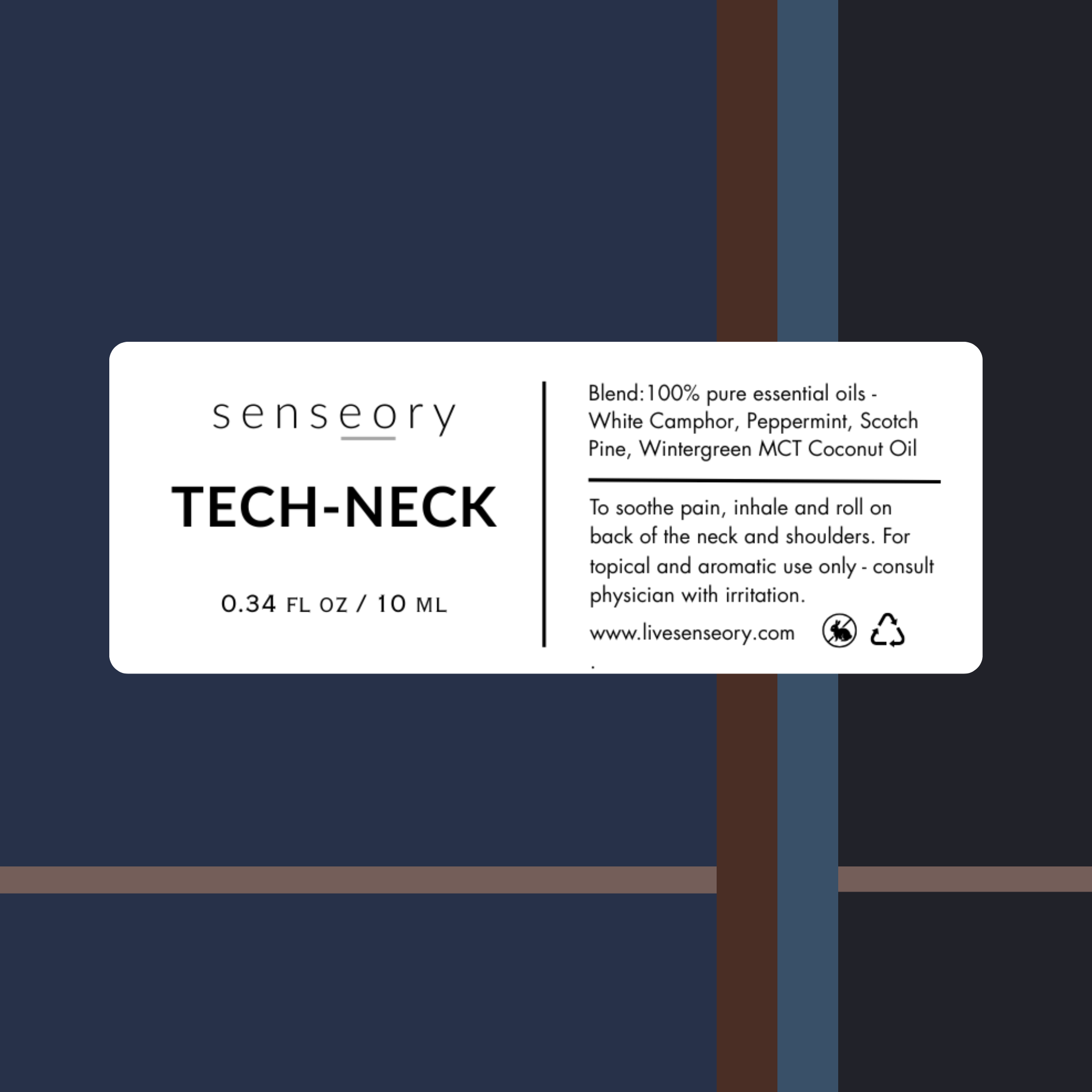 Ahhhh TECH-NECK— our most popular 10 ml roll-on 'remedy' blend with instant, cooling muscular relief that lasts up to an hour, keeping posture, neck alignment, and energy top-of-mind. Infused with a blend of carefully selected essential oils, together, they create a powerful reset that eases tension, sharpens focus, and helps you get back to what matters — without the distraction of neck and shoulder pain. Tech-Neck is a busy achiever's favorite blend by easing tension, restoring posture, and keeping energy strong so you can focus — not fidget.