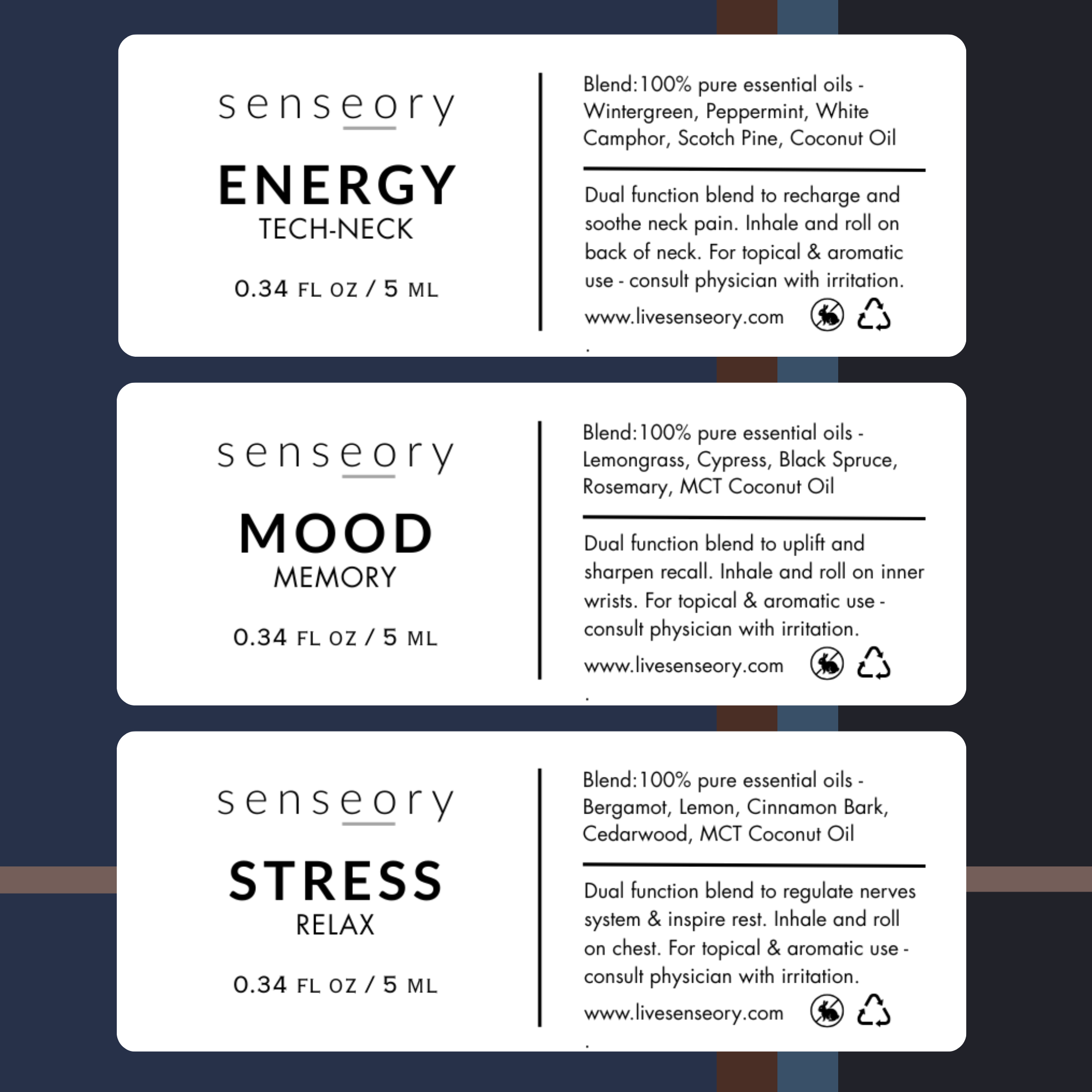 Calm your nervous system, reduce tension, and transition into deeper rest at night. Inhale and roll on sides of the neck from collarbone up towards jawline. Stress Relax  is a blend of 100% pure essential oils; lemongrass, rosemary, black spruce and cypress.