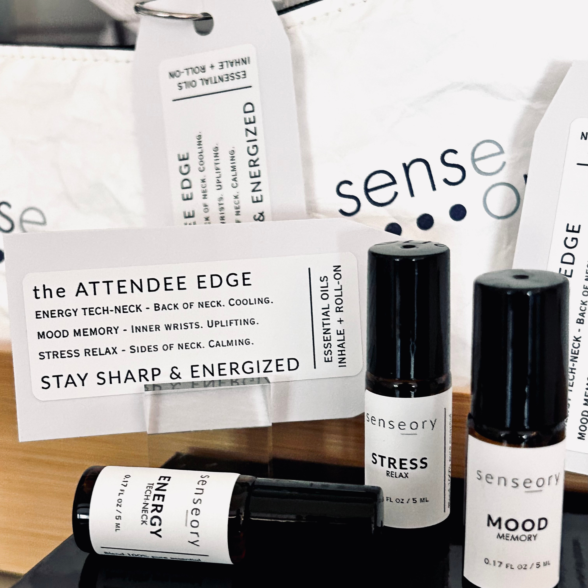 Smartly packaged in an eco zipper case crafted from recycled billboards, this bundle is portable, sustainable, and purposeful—popular as an event swag bag, retreat gift, or trial-sized introduction to the Senseory essential oil collection.